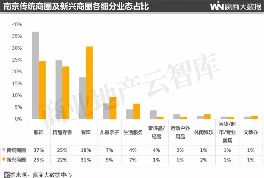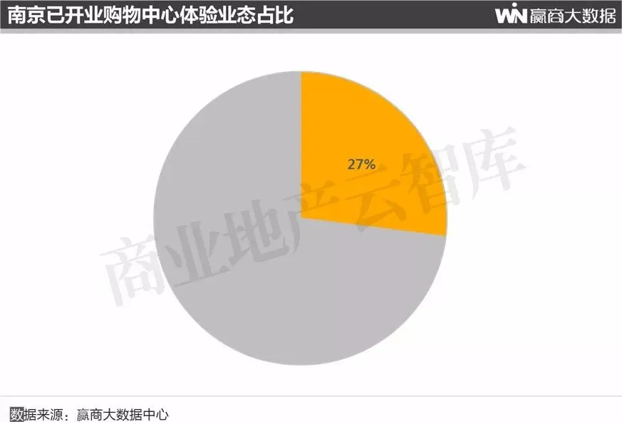 在目前全国商业同质化竞争加剧、增长乏力的环境下,体验性日渐成为商业发展潜力重要评价标准之一,据赢商大数据中心对全国典型城市的监测,购物中心体验业态平均占比达47%,相比之下南京购物中心体验业态占比仅27%,存在较大差距,整体体验度有待提高。