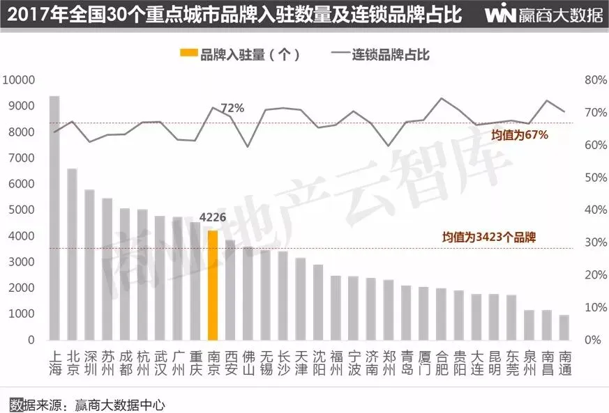 据赢商大数据中心对全国30个重点监测城市的品牌发展状况对比分析,南京市品牌数量4226个,位居第10位,处于中上水平;在已入驻南京的所有品牌中,连锁品牌占比达72%,远高于30个城市的均值水平,将一定程度上造成各购物中心品牌同质化问题。