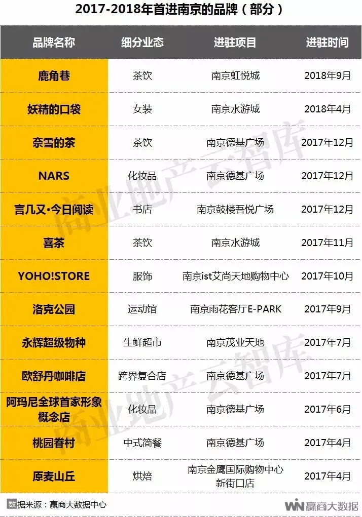 据赢商大数据中心监测,2017-2018年首进南京购物中心的品牌超过30个,覆盖茶饮、化妆品、服饰、运动健身多个业态。其中不乏全国首店,如YOHO!STORE、妖精的口袋等线上品牌的全国首家实体店,还有阿玛尼、NARS等时尚品牌,还有多家“网红”餐饮品牌,如喜茶、奈雪的茶、桃园眷村、原麦山丘等,以及言几又·今日阅读等。