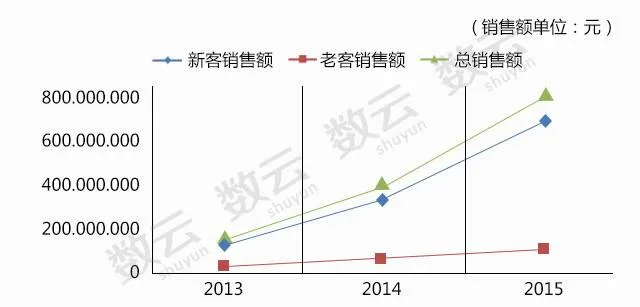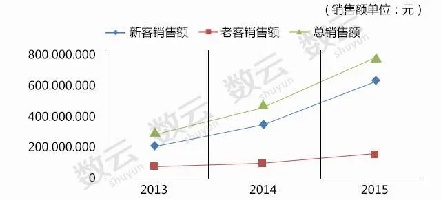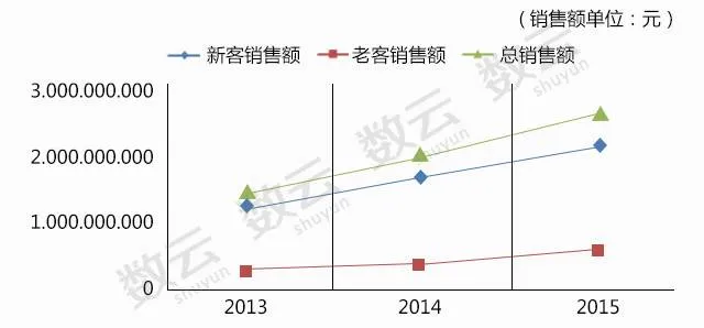 2013-2015期间,新客销售额总体上涨,但2015年明显放缓;老客的销售额贡献平缓上涨。