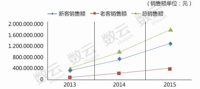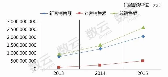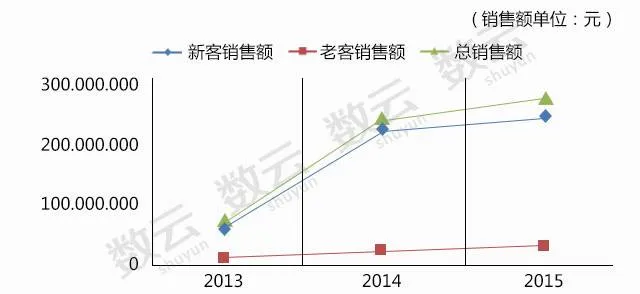 2013-2015期间,新客销售额增长快速,老客的销售额贡献平缓上涨。