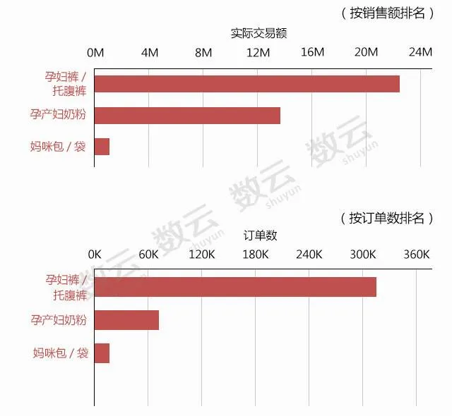 在2015年淘宝孕妇产品的子类目中,孕妇裤/托腹裤的销售额和交易量均高居榜首。