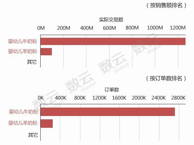 在2015年淘宝婴童食品的子类目中,婴幼儿牛奶粉的销售额和交易量均高居榜首。