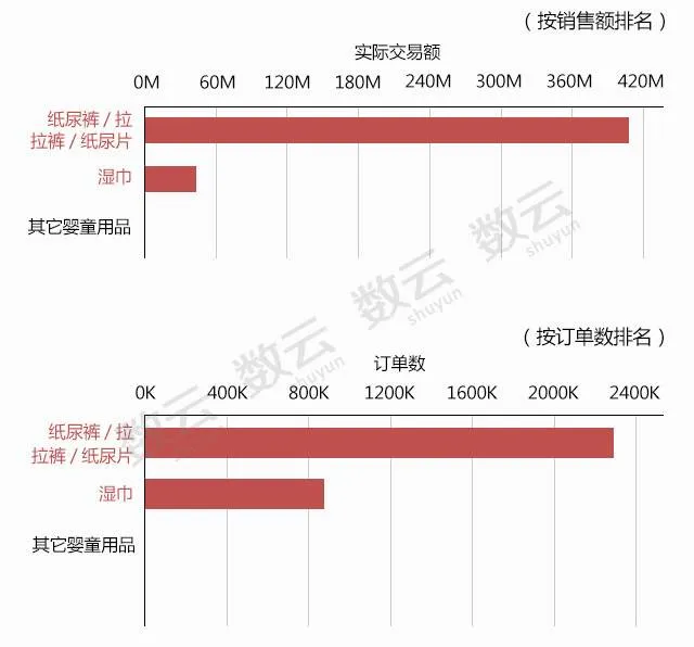 在2015年淘宝婴童用品的子类目中,纸尿裤/拉拉裤/纸尿片的销售额和交易量均高居榜首。