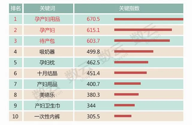2015年淘宝孕妇产品关注指数排名前10的关键字:孕产妇用品、孕产妇、待产包、吸奶器、孕妇枕、十月结晶、产妇用品、美德乐、产妇卫生巾、一次性内裤。
