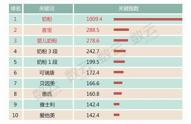 2015年淘宝婴童食品关注指数排名前10的关键字:奶粉、喜宝、婴儿奶粉、奶粉3段、奶粉1段、可瑞康、贝因美、惠氏、雅士利、爱他美。