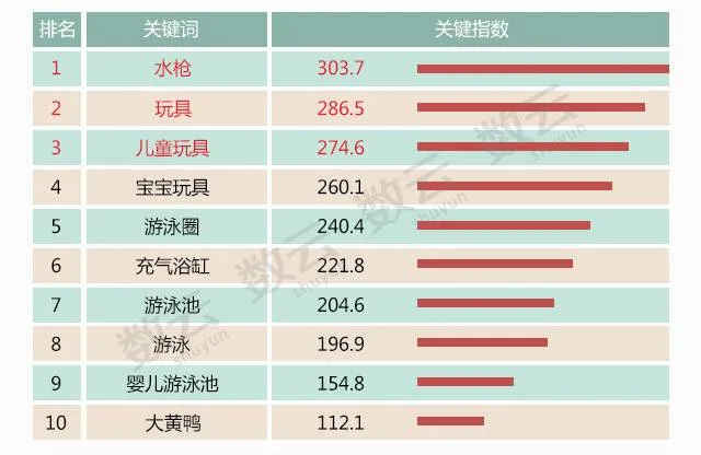 2015年淘宝婴童玩具关注指数排名前10的关键字:水枪、玩具、儿童玩具、宝宝玩具、游泳圈、充气浴缸、游泳池、游泳、婴儿游泳池、大黄鸭。