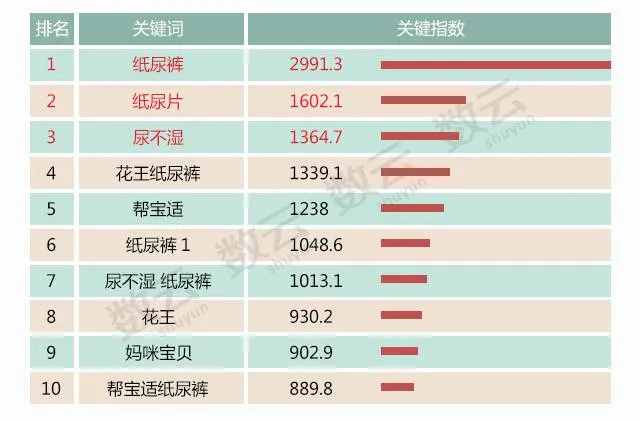 2015年淘宝婴童用品关注指数排名前10的关键字:纸尿裤、纸尿片、尿不湿、花王纸尿裤、帮宝适、纸尿裤1、尿不湿 纸尿裤、花王、妈咪宝贝、帮宝适纸尿裤。