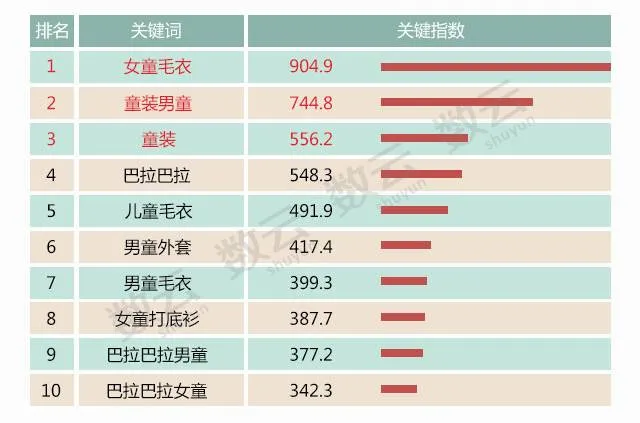 2015年淘宝童装关注指数排名前10的关键字:女童毛衣、童装男童、童装、巴拉巴拉、儿童毛衣、男童外套、男童毛衣、女童打底衫、巴拉巴拉男童、巴拉巴拉女童。