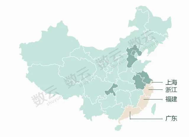 婴童玩具店铺比较集中在沿海经济比较发达的区域,其中占据销售额Top的省份分别为上海、广东省、福建省、浙江省。