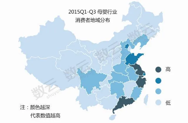母婴行业消费者主要分布在东部地区,尤其是华南和华东,中西部地区占比较低,消费人群主要集中在东南沿海省份以及部分内陆省份。