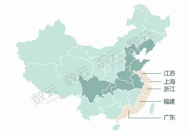 童装店铺比较集中在沿海经济比较发达的区域,逐渐向内陆地区过渡,其中占据销售额Top的省份分别为浙江省、广东省、上海、江苏省、福建省。