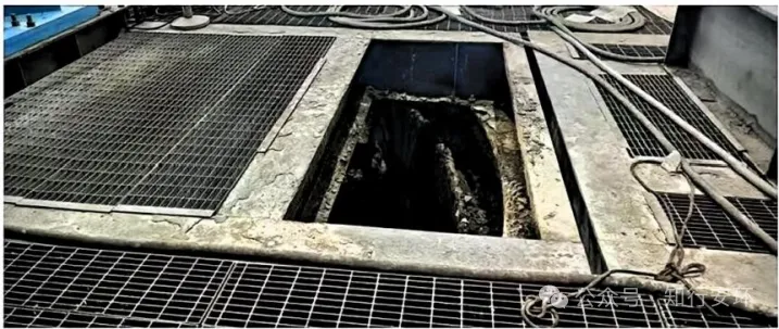 经现场勘查,事故发生在中金内蒙古矿业三系列浮选车间1#浮选机浮选槽上方作业平台,坠落洞口(见图1)为长方形,长2600毫米,宽1080毫米,事发前洞口区域加装1根槽钢,型号为[10,高度10毫米,腿宽50毫米,长度2600毫米,槽钢上铺5块格栅踏板,4块尺寸为1050×550毫米,1块尺寸为1050×360毫米。洞口下方为1#浮选机浮选槽,直径8000毫米,高6500毫米。作业平台未见安全警示标牌。现场设有安全路线,宽度1200毫米,通道南侧临边有防护栏,护栏高度1200毫米,挂有“当心坠落”“禁止倚靠”安全标志。