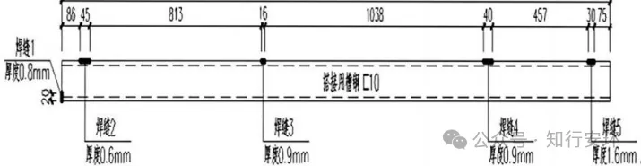 2.脱落槽钢与工字钢主梁呈平对接焊方式,此种焊接方式焊缝的剪力和弯矩承载能力较差。槽钢长度方向不均匀分布四段焊缝(长度介于16~45毫米之间,厚度介于0.6~1.6毫米之间),槽钢一端有一段焊缝(长度20毫米,厚度0.8毫米)。