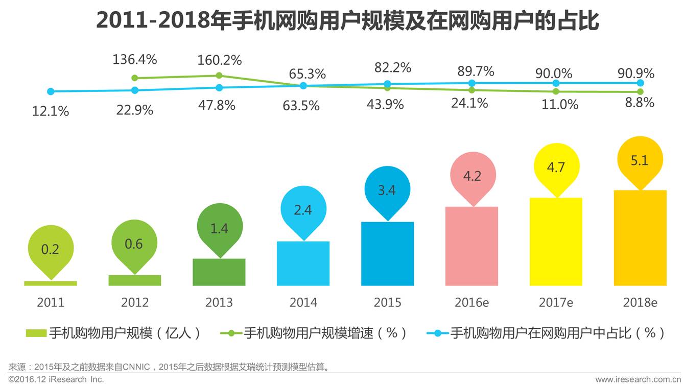 2015年手机购物用户规模3.4亿人,在网购用户中占比82.2%