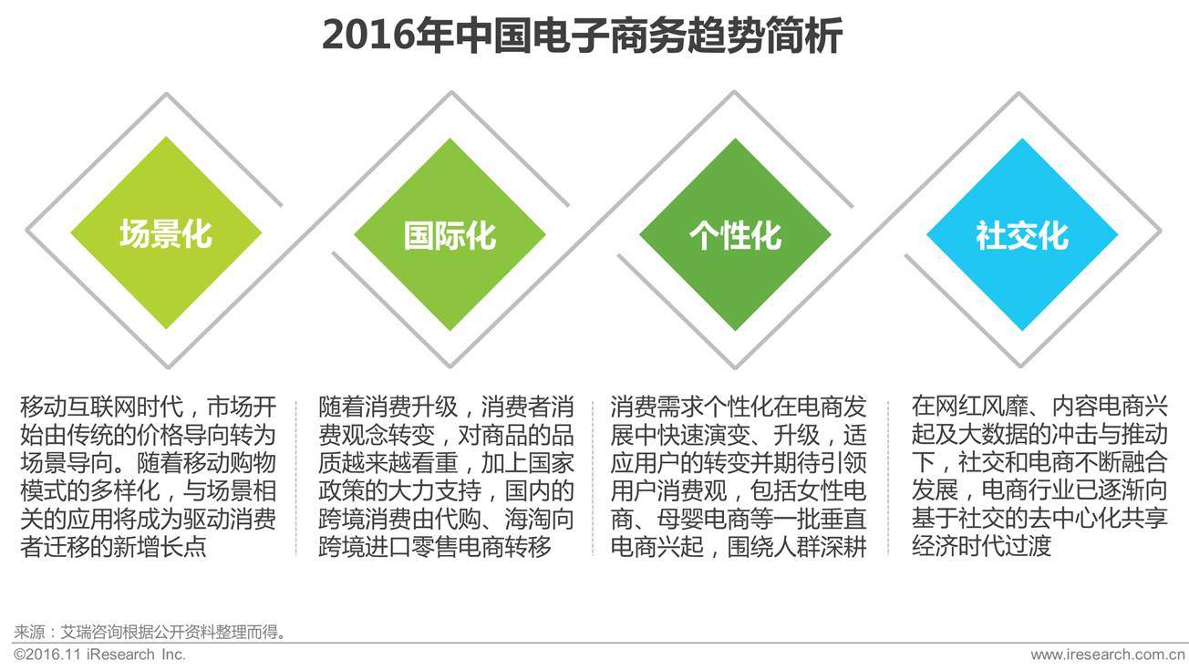 中国电子商务现状:电商生态发展,规模稳定增长;四大巨头,各领风骚;用户队伍壮大,性别趋于均衡。中国电子商务趋势:场景化、国际化、个性化、社交化。