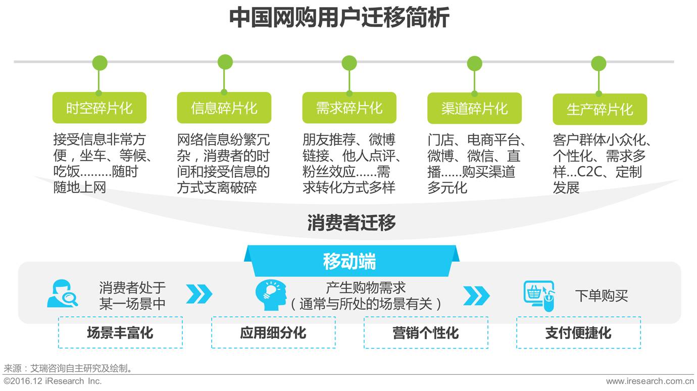 移动互联网时代,信息渗透无处不在,购物受时间、空间限制更小,消费行为变得分散,任何一个生活场景都有可能转化为实际消费——市场开始由传统的价格导向转为场景导向。随着移动购物模式的多样化,O2O、特卖等与场景相关的应用将成为驱动消费者迁移的新增长点。