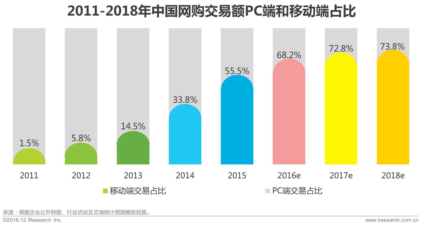 2015年中国移动网购交易规模达2.1万亿元,在整体网络购物交易规模中占比达55.5%,比去年增长21.7个百分点,移动端超过PC端成为网购市场更主要的消费场景。移动端随时随地、碎片化的特点及智能手机、无线网络的普及使移动端成为消费者网购普遍场景,用户消费习惯转移、各企业持续发力移动端是移动端不断渗透的主要原因。