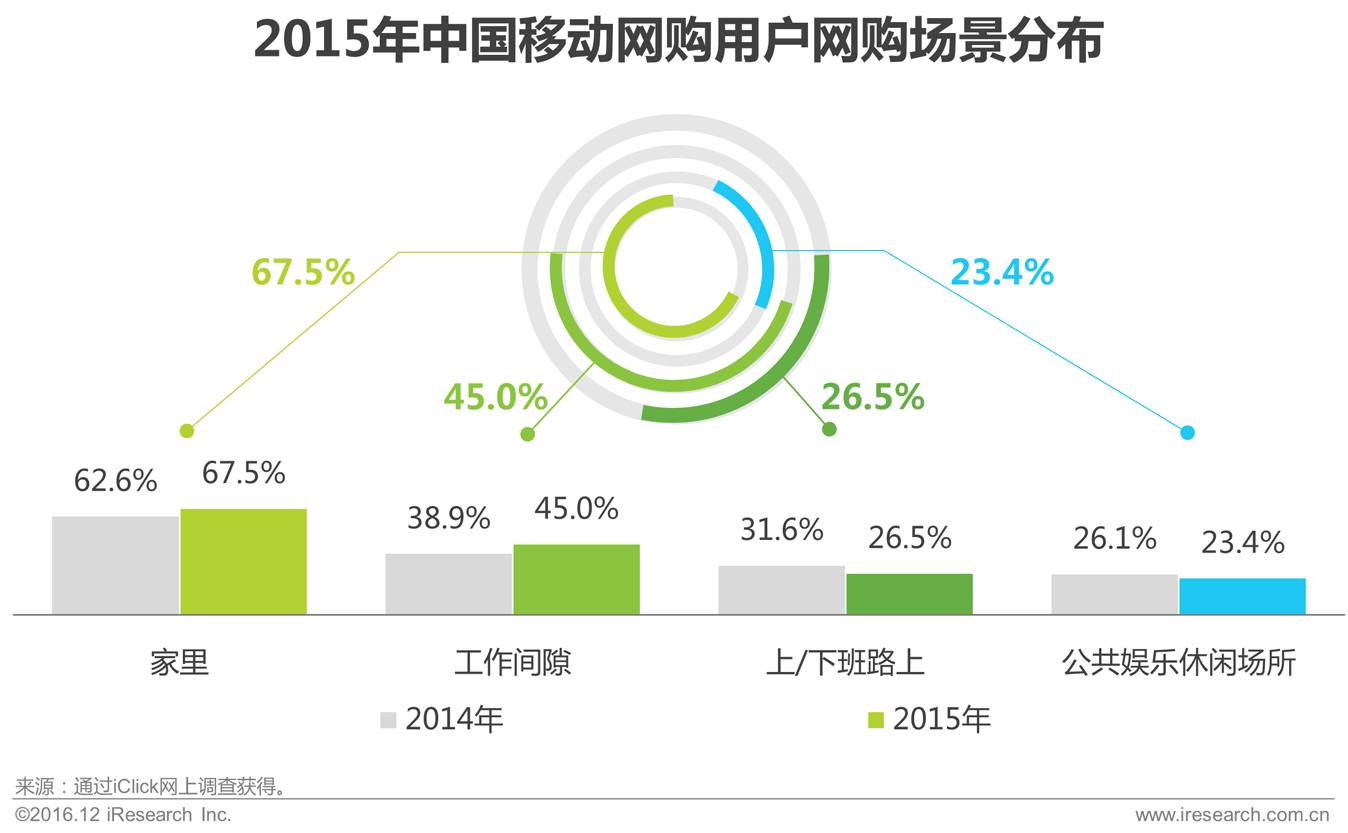 与2014年相比,网购场景由PC端更多地转移到移动端。用户在家里和工作间隙两个主要网购场景下使用移动端进行网购的比重增加。切合移动端碎片化特点和用户在工作间隙网购的习惯,许多电商在用户使用高峰期进行商品上新,例如特卖电商唯品会早10点晚8点上线特卖。