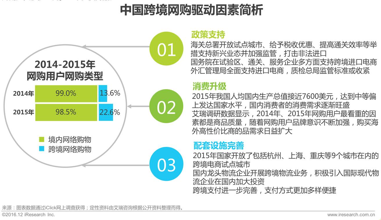 跨境电商的发展主要得益于政策支持、消费升级和配套设施的完善。利好政策的出台降低了跨境电商经营成本,为跨境电商提供了更广阔的发展空间。消费升级拉升了消费者对全球化高品质商品的购买需求。物流、支付等配套设施的完善使网购用户更便捷地网罗全球优质商品。