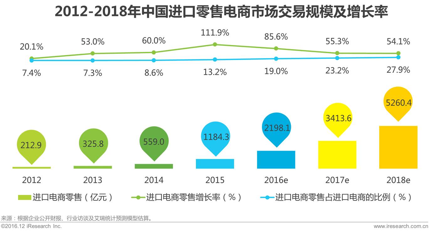 随着2014年下半年进口电商零售政策的放开,大量内贸电商和创业企业涌入进口电商零售市场。2015年,该市场的市场规模达到1184.3亿元,增长率为111.9%,在进口电商中的渗透率达13.2%。未来几年,在政策基本面保持利好的情况下,进口电商零售市场仍将保持平稳增长。