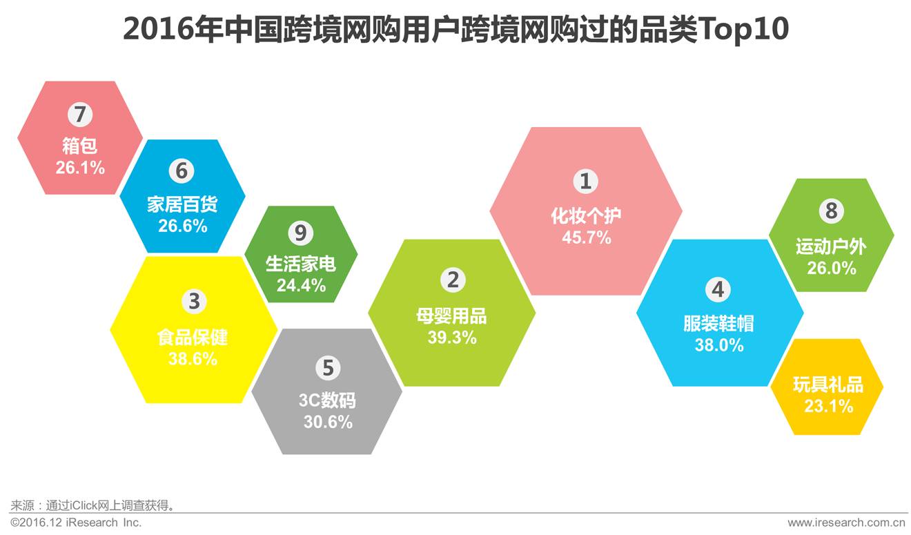 用户跨境网购偏爱购买化妆个护、母婴用品、食品保健等对安全和品质有较高要求的品类,对服装鞋帽也有比较旺盛的需求。而这些都是包括唯品会、美丽联合集团等以女性为要用户的电商企业的优势品类。