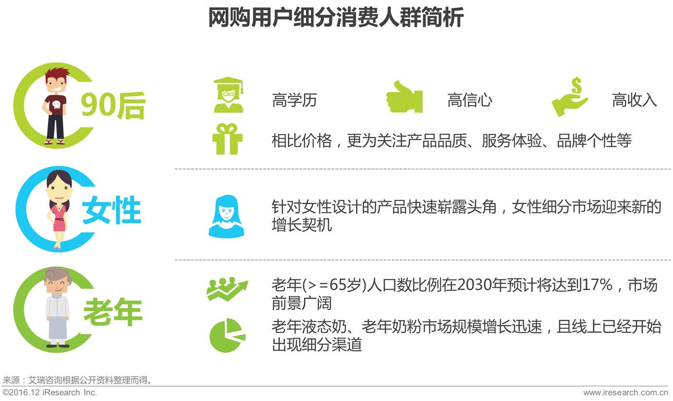 国民经济快速发展,人民生活水平提高,用户更加注重商品品质,各方面消费力量兴起,90后、女性和老年群体成为消费新动力。不同性别、年龄、家庭角色的用户需求不尽相同,他们将选择符合自身特征的商品。商业回归产品与服务本质,生产出更符合消费需求的产品、提供更加精细化的运营和包括内容在内的个性化的服务。