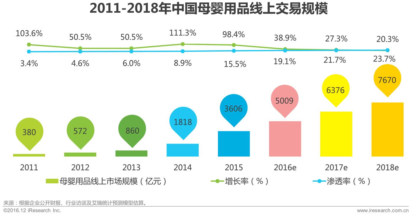 2015年母婴网购市场规模3606亿元,增长98.4%
