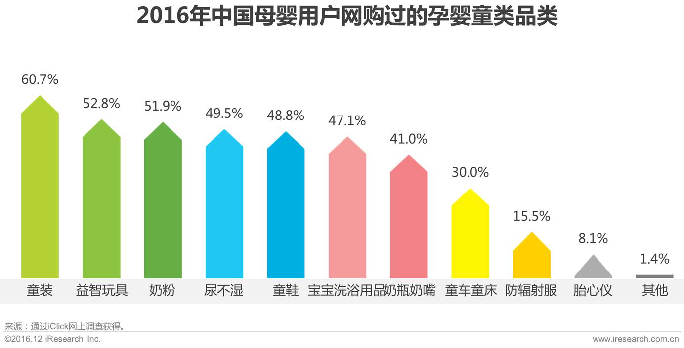 在奶粉、尿不湿等标品竞争激烈的市场状况下,童装和益智玩具杀出重围,成为母婴用户网购最多的品类。奶爸奶妈不仅自己爱网购服装鞋包,也爱给宝宝网购服装,童装占比60.7%,较其他品类拉开了一定的差距。