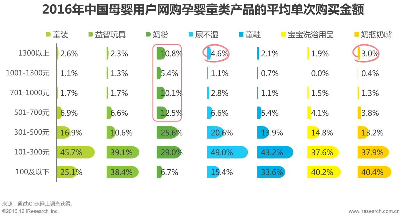 随着生活质量提高,人们非常重视食品安全问题,奶粉、奶瓶奶嘴作为宝宝需要入口的品类,高客单价用户较多,尤其是奶粉的客单价明显高于其他品类。而尿不湿不仅购买频率高,购买客单价也高。此外,平价消费仍是主流消费,除奶粉外,其余孕婴童产品客单价多集中于101-300元。