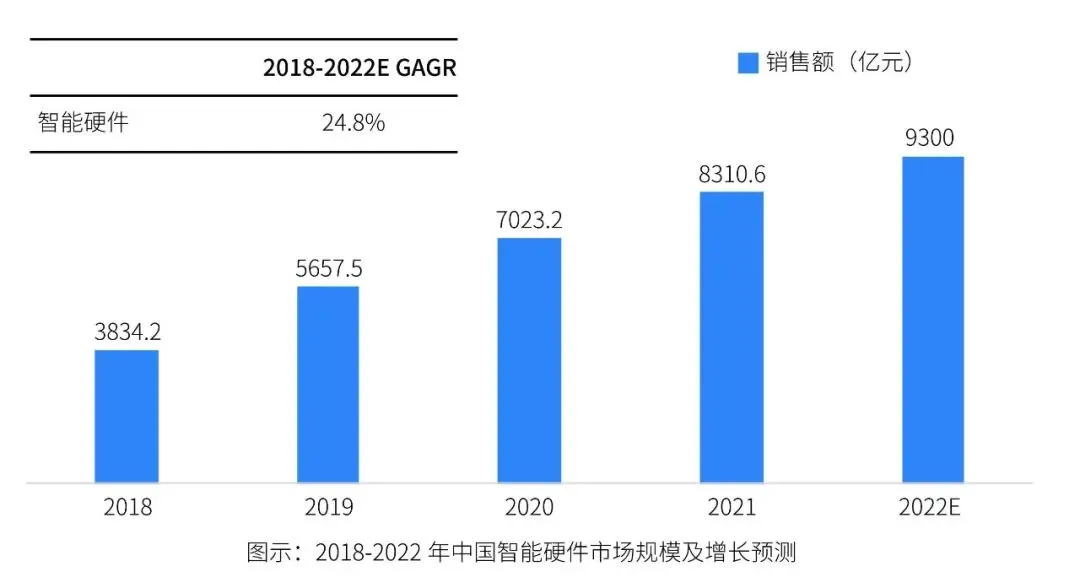 我国智能硬件行业前景广阔,近五年销售额年均增长24.8%。