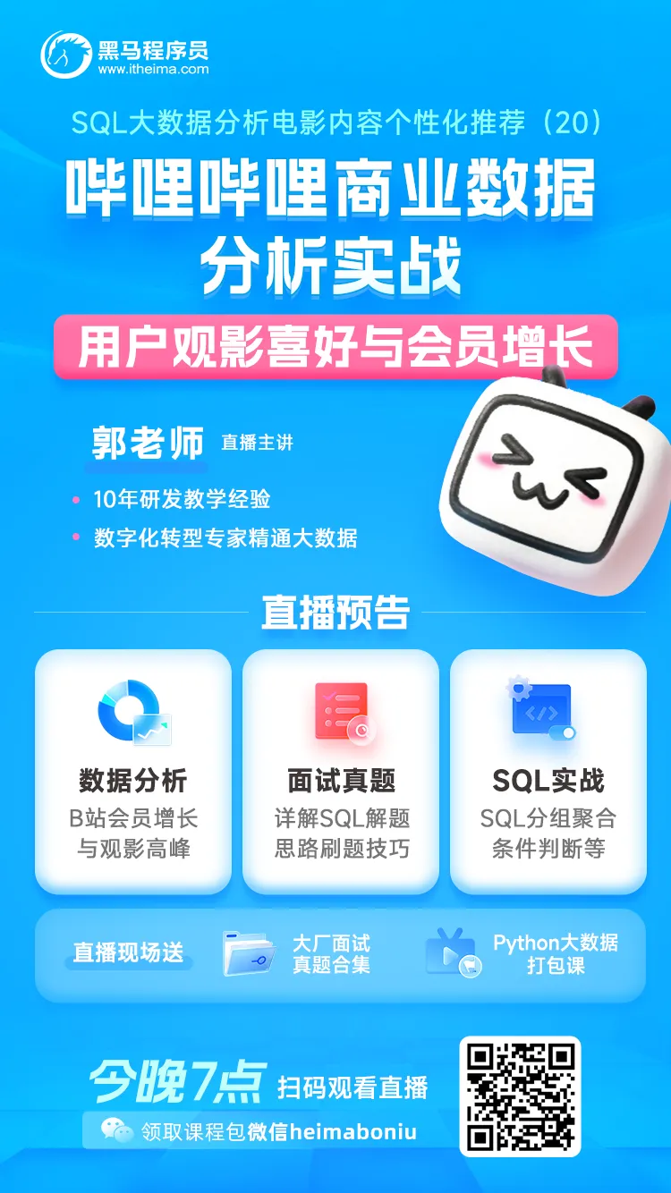 今天,黑马程序员郭老师将带大家用SQL深入分析哔哩哔哩平台的各类数据,讲解分析会员增长、观影高峰期、订单情况、退款率等实际案例,同时揭秘如何通过数据找到符合用户喜好的电影进行个性化推荐。