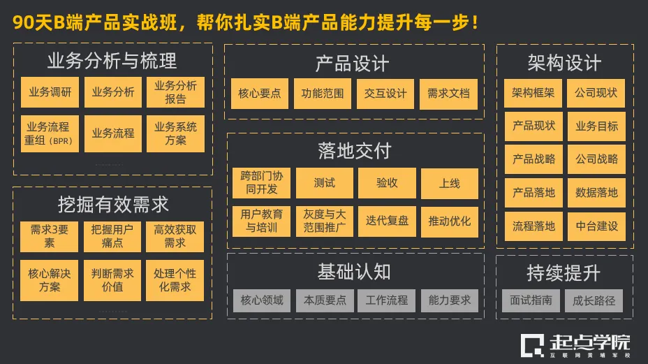 为了帮助大家顺利转岗/入门B端产品,并且能够胜任此后2-3年的工作。“腾讯课堂&起点学院”联合打造了一门B端产品体系课——《90天B端产品经理实战班》帮助大家系统提升B端产品能力。