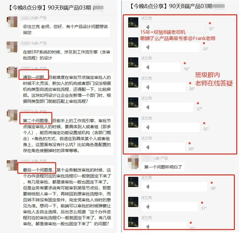 课程考虑到B端业务场景的复杂性,除了日常答疑,每周四还配有产品业务咨询会,授课老师会在班级群里给大家专门开小灶,通过语音直播的形式,帮助大家解决在工作中的具体产品/业务问题~