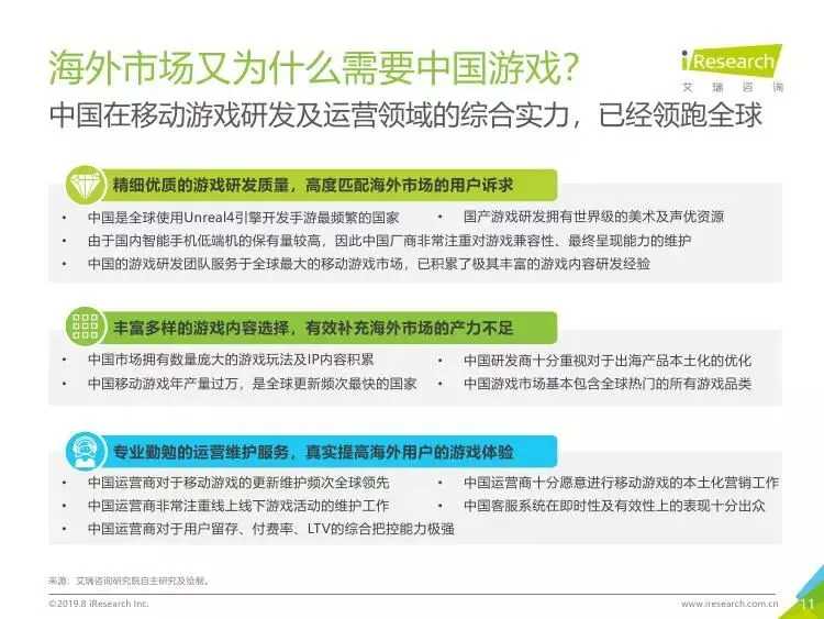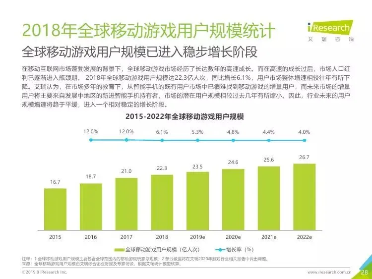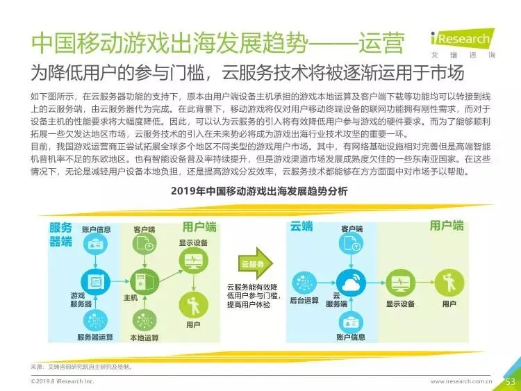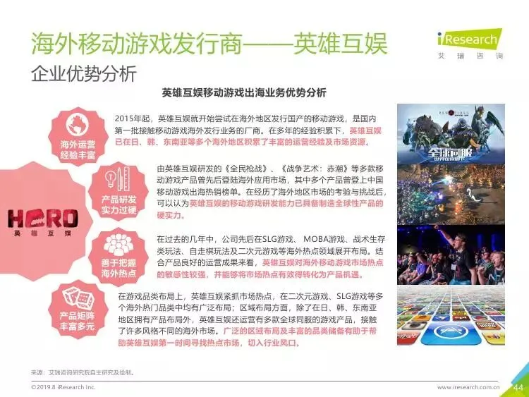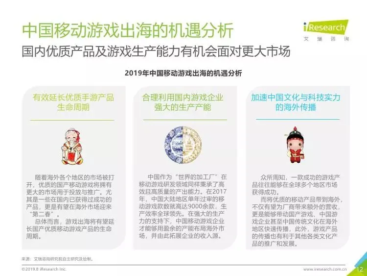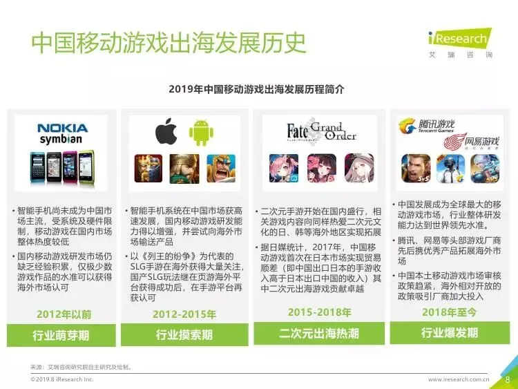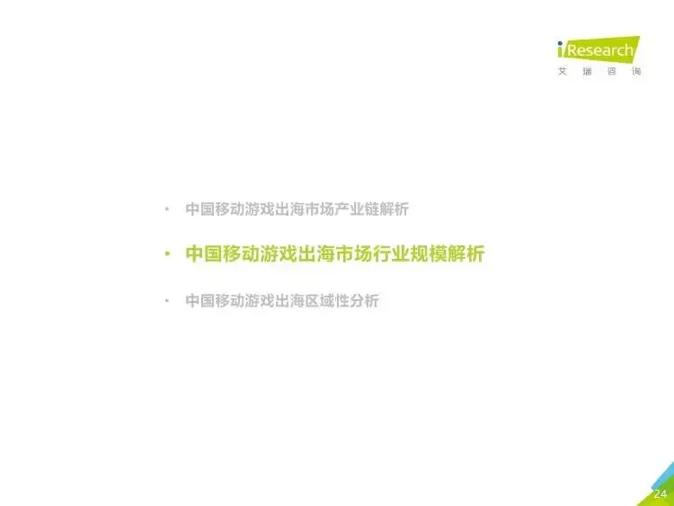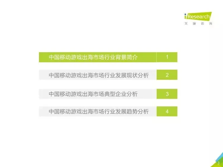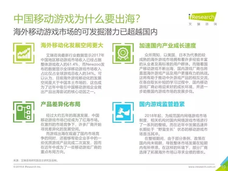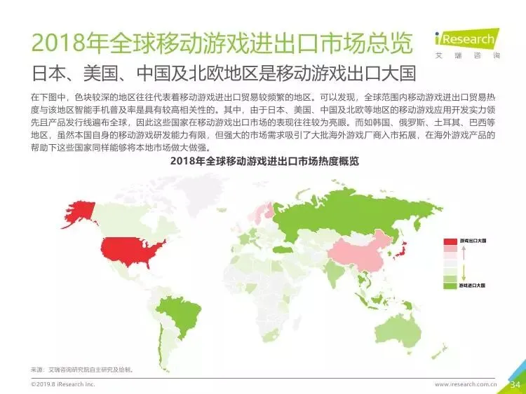 2019年中国移动游戏出海行业研究报告》是艾瑞针对中国移动游戏出海市场发布的行业研究报告,报告通过对近两年中国移动游戏出海产品及相关数据的罗列与分析,对整个移动游戏的出海市场现状进行了解读,并展望了市场未来可能的发展趋势。报告中包含了全球游戏市场及用户规模、中国移动游戏出海市场规模、中国移动游戏出海大事件及中国移动游戏出海趋势解读等核心内容。