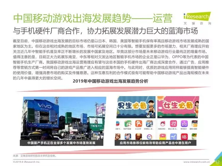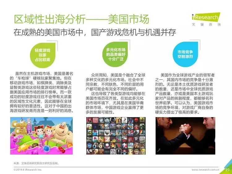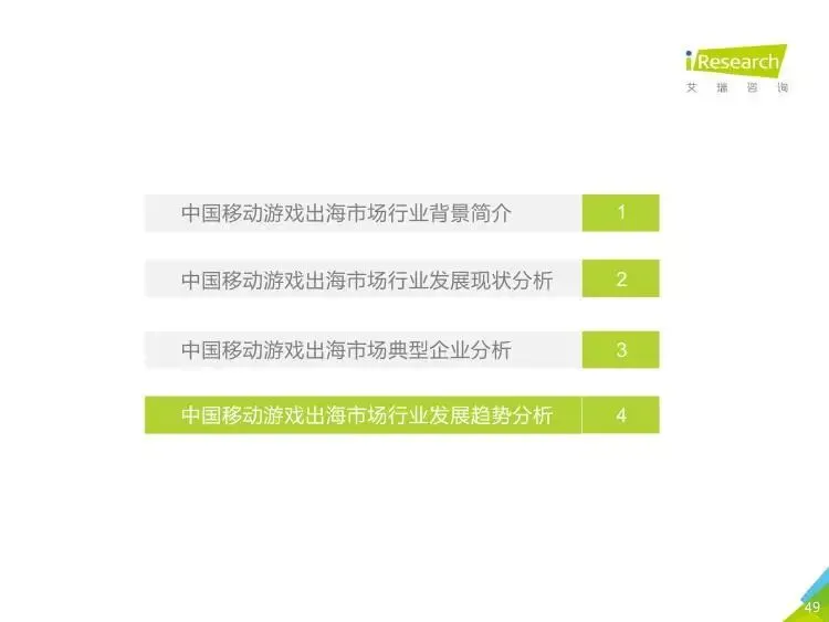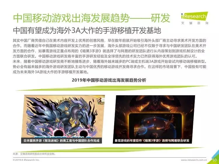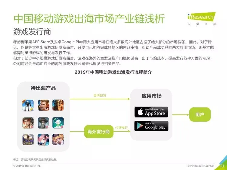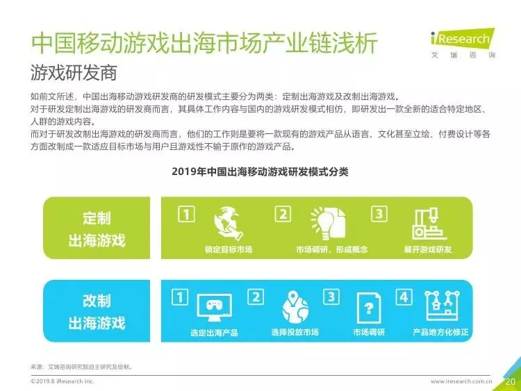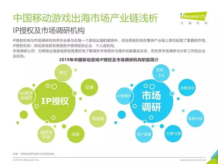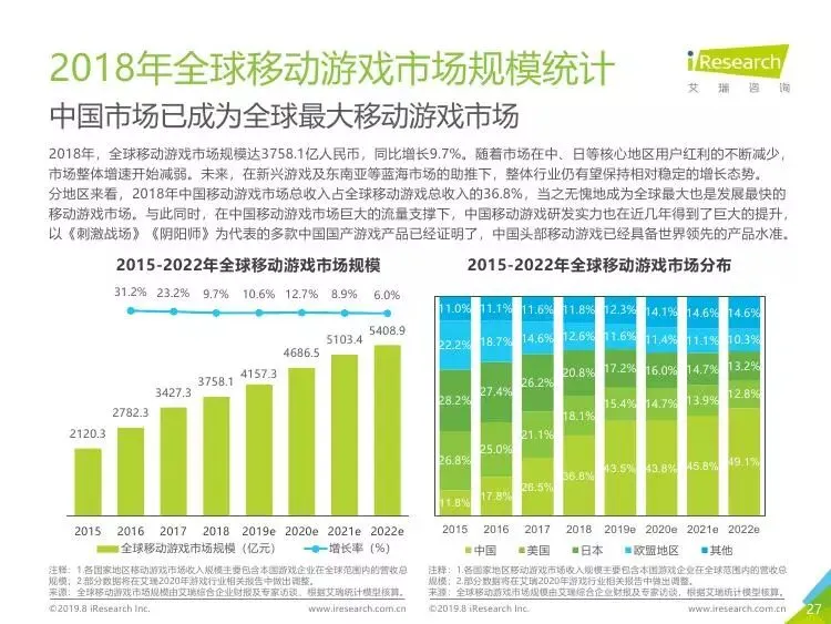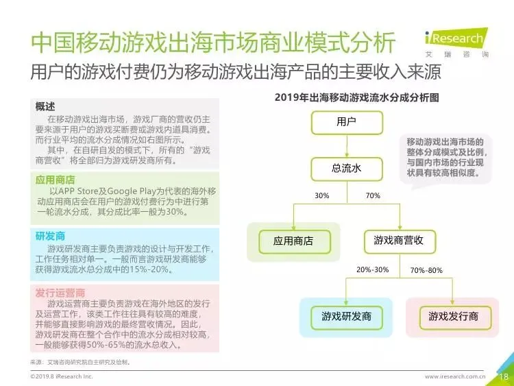 2019年中国移动游戏出海行业研究报告》是艾瑞针对中国移动游戏出海市场发布的行业研究报告,报告通过对近两年中国移动游戏出海产品及相关数据的罗列与分析,对整个移动游戏的出海市场现状进行了解读,并展望了市场未来可能的发展趋势。报告中包含了全球游戏市场及用户规模、中国移动游戏出海市场规模、中国移动游戏出海大事件及中国移动游戏出海趋势解读等核心内容。