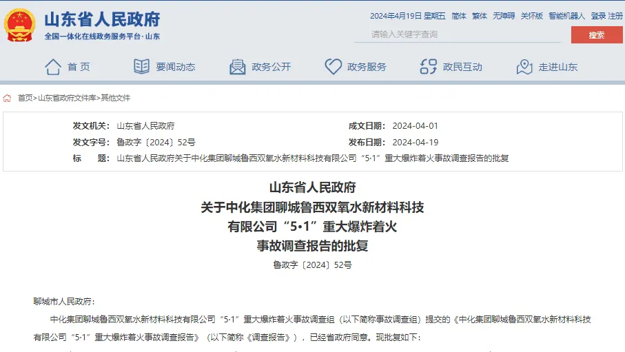 中化集团聊城鲁西双氧水新材料科技有限公司“5·1”重大爆炸着火事故调查组(以下简称事故调查组)提交的《中化集团聊城鲁西双氧水新材料科技有限公司“5·1”重大爆炸着火事故调查报告》(以下简称《调查报告》),已经省政府同意。现批复如下: