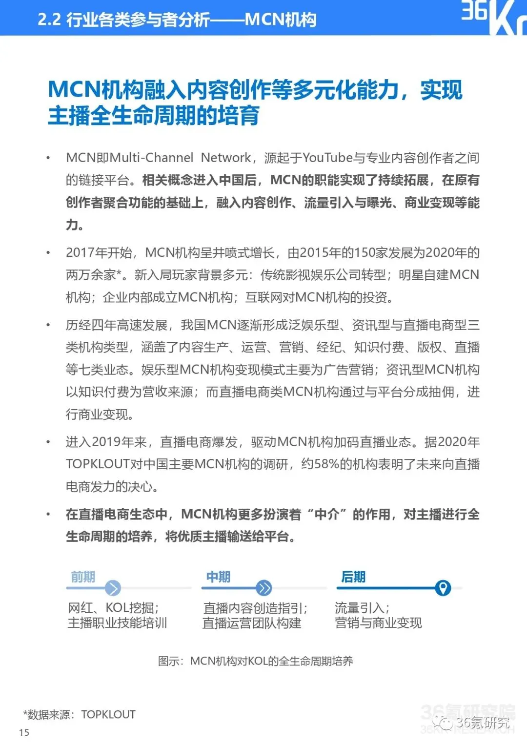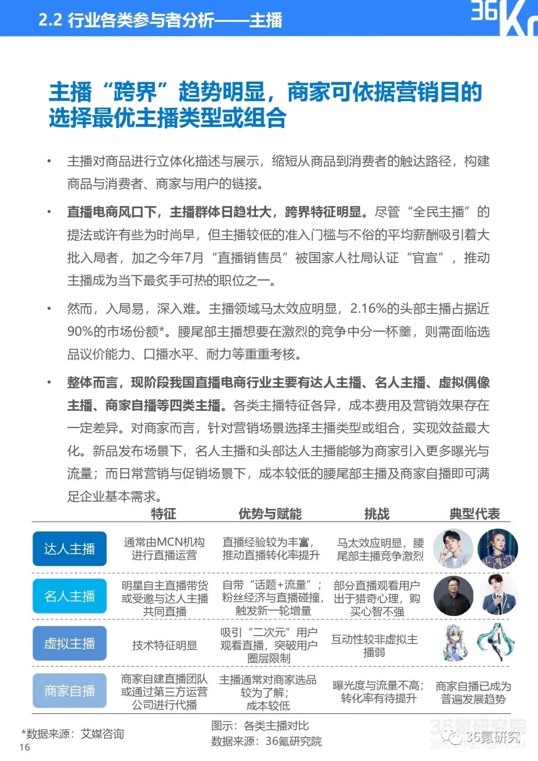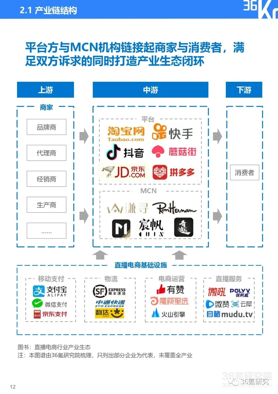 商家、平台、MCN机构与主播为直播电商行业的主要参与方。商家提供产品基础,主播及其背后的MCN机构以直播为媒介传递商品信息,通过平台实现商品至消费者的触达。