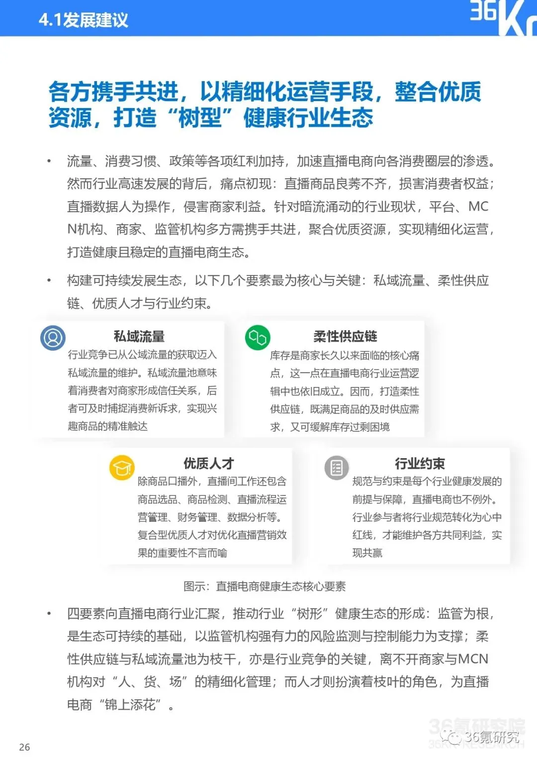 打造健康业态,离不开行业各方的携手共进。监管部门强化直播电商行业规范,为行业健康发展构建完善的顶层法律法规体系;商家、平台与MCN机构共同推动柔性供应链建立、维护私域流量、孵化与培育复合型直播人才,实现运营精细化,汇聚优质行业资源,为直播电商持续注入新动能。