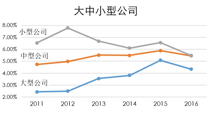 五年之前,大中小三类公司打平收益率阶级明显。但小型公司的打平收益率每年下降;中型公司基本持平;大型公司逐年上升。目前而言,大型公司的打平收益率,仍低于中小公司。