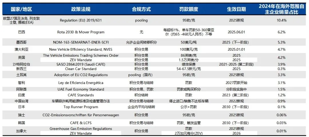 据中汽数据统计,全球有多个国家或经济体已采取类似“碳积分”的管理模式,其中自2025年新生效或开启下一阶段考核的国家超过一半,法规整体趋严。而具有碳积分法规的国家及地区包含欧盟、英国、沙特、墨西哥、巴西、澳大利亚等自主企业出海热门目的市场,2024年销量约占自主企业海外总销量的35%,且呈逐年上升趋势。相比准入管理,积分类法规呈政策更新快、合规链路长、管理内容杂等特点。在自主企业海外销量攀升背景下,能耗及碳排放管理合规机遇与风险并存。建议企业重点关注热点国家法规变化,规避合规风险,“掘金”海外市场。