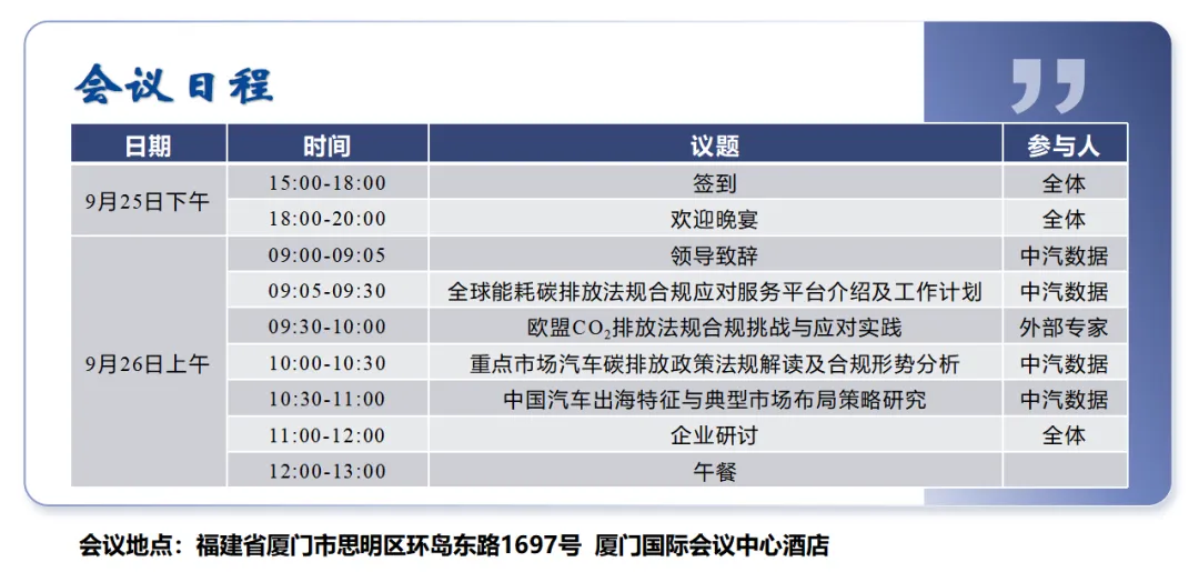 为助力企业构建全球碳合规核心竞争力,中汽数据有限公司决定发起成立“全球能耗碳排放法规合规应对服务平台”,并定于2025年9月25日—26日在厦门召开启动会。平台依托全面政策解读信息库、独家积分核算数据体系、行业认可的积分价格研究方法等资源积累,通过集中专业的技术和专家优势,为出海企业提供高水平的公共服务产品,帮助企业快速建立起应对全球能耗碳排放积分合规能力体系,从而提升集体应对风险的能力,形成更高维度的产业协同,将中国汽车产业从全球规则的接受者,转变为积极的、有准备的参与者。