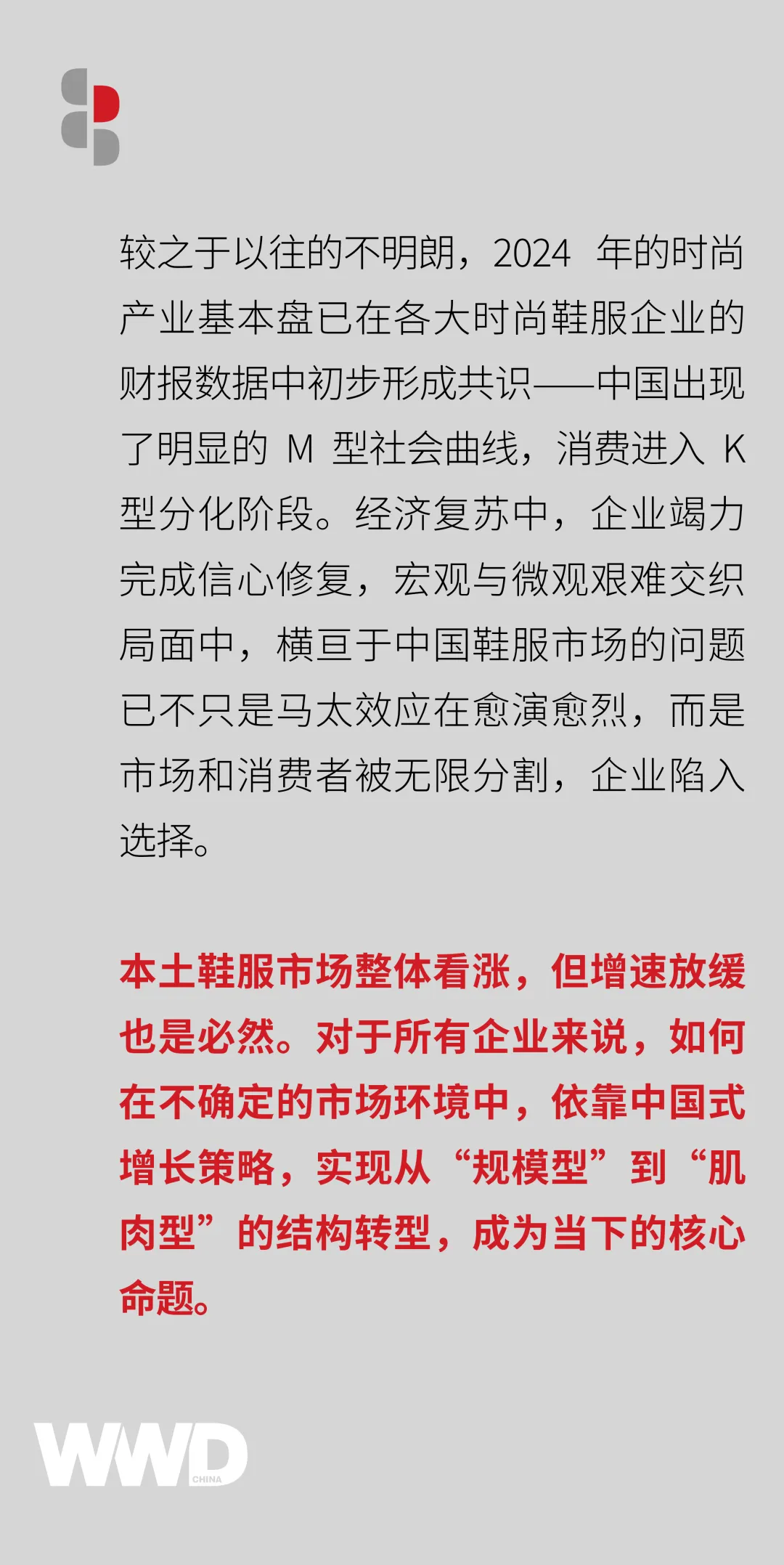 从业绩和策略来看,本土鞋服企业们“跑马圈地”式的增长方式已成过去,进入“精耕细作”的运营模式。在整体向稳的消费环境下,服饰市场大盘还会增长,但增速放缓也将成为必然。而在这一关键时期,对于所有企业来说,能不能保住存量、找到增量,比拼的是综合实力。WWD