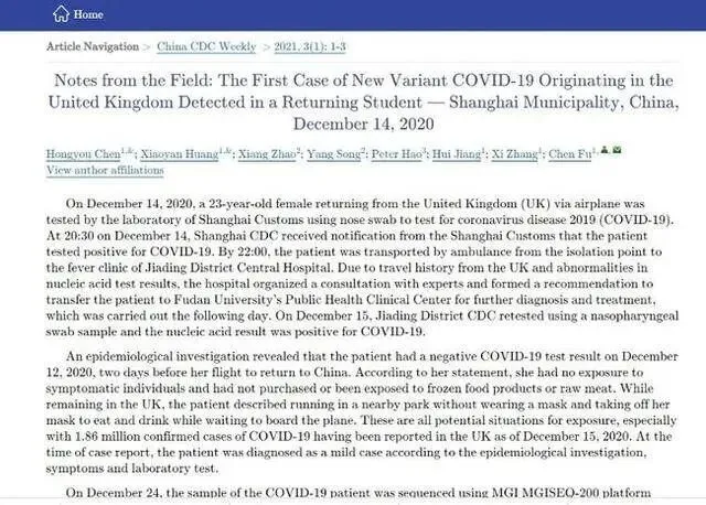 据报道,《中国疾控中心周刊》研究报告显示,该病例是一名23岁的女学生,近期从英国乘飞机返回上海,12月14日检测出新冠病毒呈阳性,当晚被转移到医院隔离。