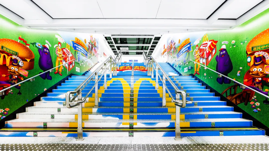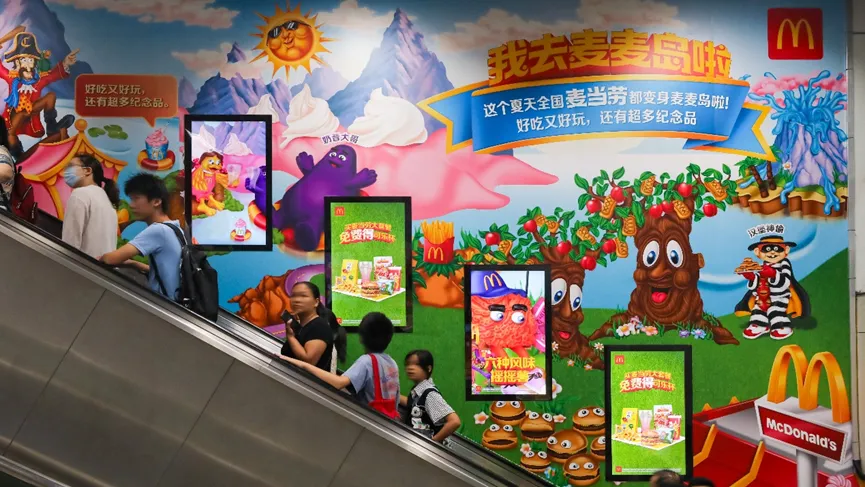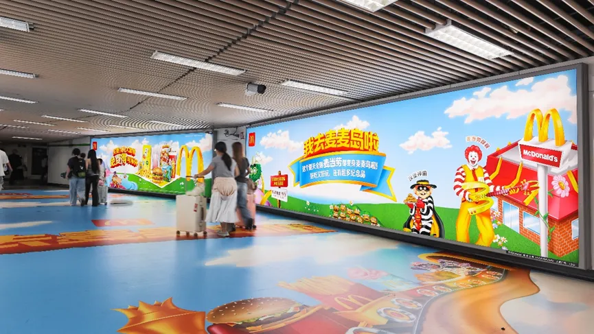 今年8月,麦当劳在上海人民广场地铁站和北京朝阳门地铁站打造“麦麦岛登陆”主题地铁站。在上海,人民广场DEC电子梯牌、超级灯箱换乘通道打造沉浸式麦麦岛视觉空间。