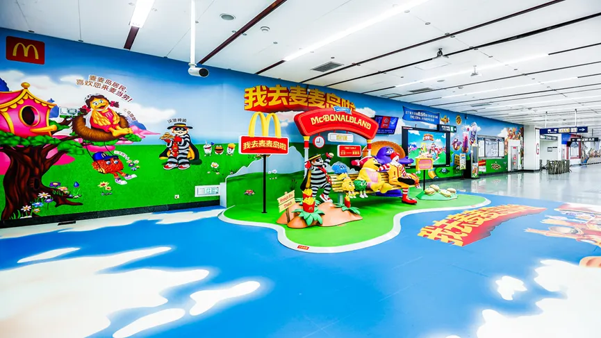 在北京,品牌区域还原为童趣卡通世界,地面绘海浪纹理,立柱装饰成麦麦岛建筑,麦当劳叔叔、奶昔大哥等经典 IP 集体亮相,唤醒用户童年记忆,将通勤用户拉入沉浸式欢乐场。品牌还设置了扫码打印合影装置,用户与 IP 角色合影后扫码,可即时打印带麦麦岛专属水印的照片,既留存情绪,也为社交传播提供素材。