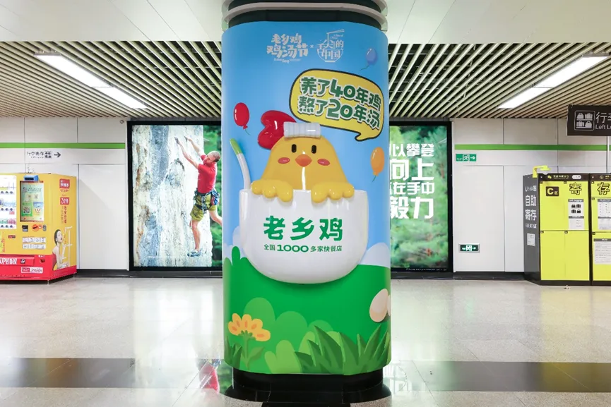 自2016年起,老乡鸡每年入冬都会举办“冬至鸡汤节”,完成从节点促销到年度品牌IP 的蜕变。第九届鸡汤节走进上海地铁L2人民广场站,以创意异形包柱打造沉浸式场景,精准触达通勤人群与家庭消费者,让“冬至喝老乡鸡鸡汤”的认知更深入人心。