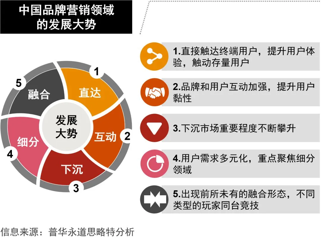 面对快速发展的数字技术以及日益丰富的内容广告,中国的品牌营销领域已经呈现出直达、互动、下沉、细分和融合五大趋势: