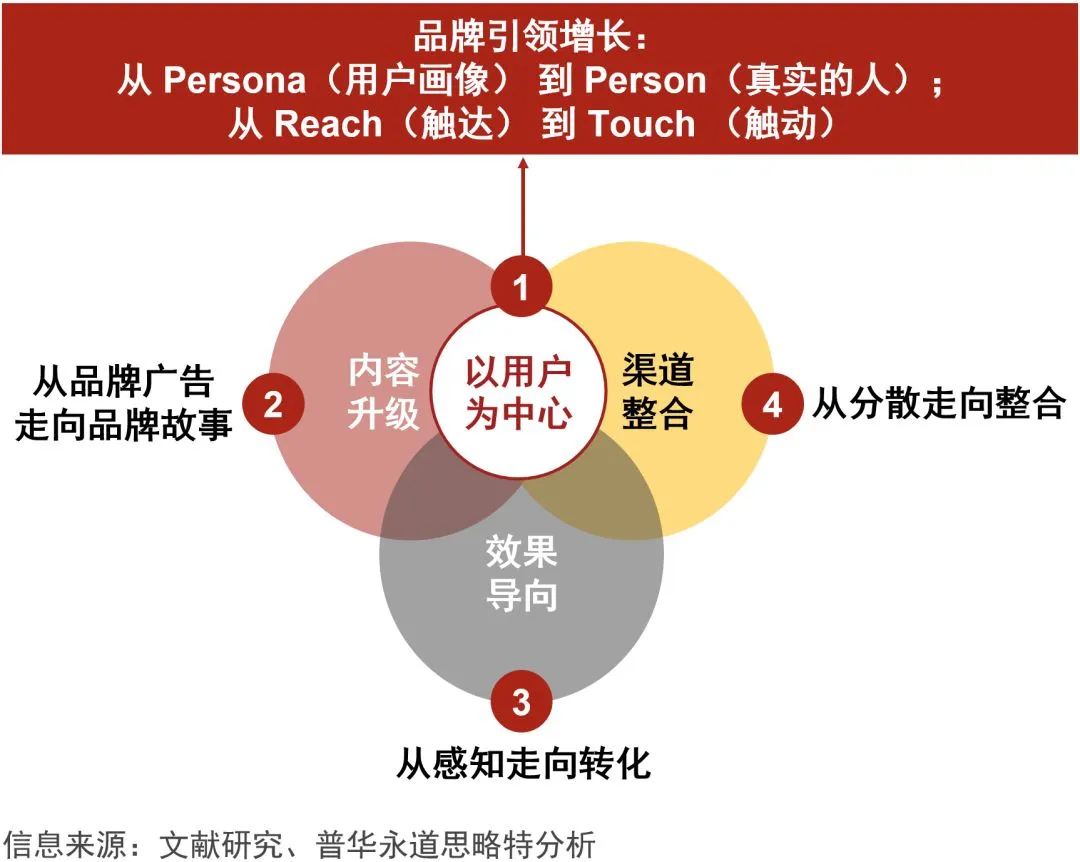 以用户为中心:营销思维由以品牌为中心转变为以用户为中心,通过覆盖用户全周期、多触点的高品质体验,实现从用户画像(persona)到真实用户(person)的过渡,以及从触达(Reach)到触动(Touch)的传播目的转变。