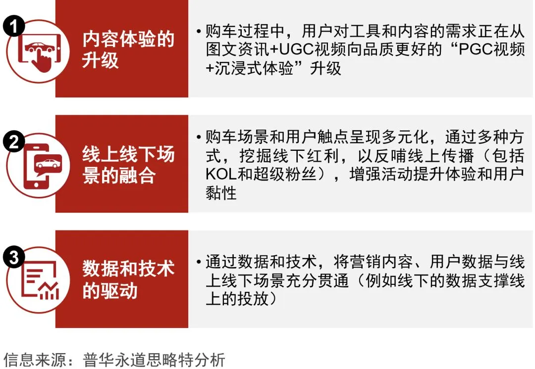 面对用户需求的更迭以及汽车市场结构的变化,许多汽车厂商已经在品牌定位、营销策略、营销渠道、营销观念上有所转变。与此同时,本轮汽车新营销更看重体验升级、场景融合以及数据与技术驱动带来的协同效果: